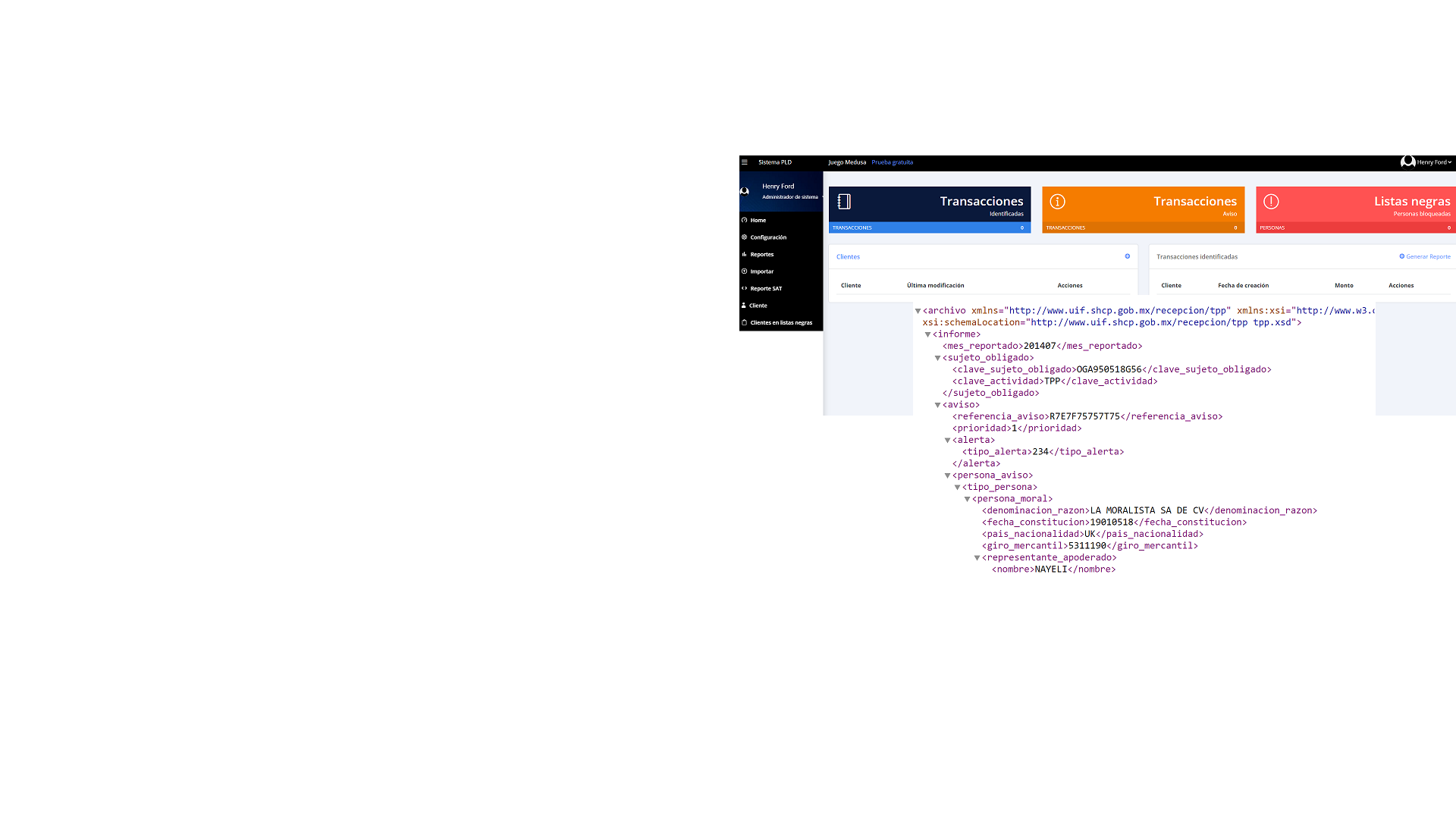 Nuestra solución permite analizar tus operaciones e identificar aquellas sujetas de aviso, creando los archivos con la información y formato necesario para su envío en el portal SAT-PLD, además te permite tener los datos de identificación de tus clientes, dueño beneficiario, representantes legales y demás información necesaria para cumplir con todo lo señalado en la Ley, incluyendo la conformación de listas de personas bloqueadas, listas negras y listas de países de alto riesgo enviando mensajes de notificación cuando exista alguna coincidencia.